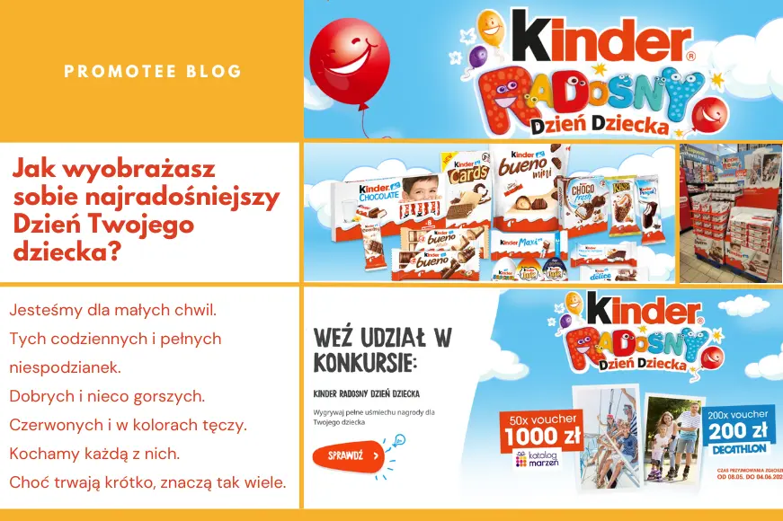 Dzień Dziecka to wyjątkowy dzień i wyjątkowe nagrody do wygrania. Do wygrania pełne uśmiechu nagrody dla dzieci. Zwycięzcy konkursu wybierani są co tydzień. Aby wziąć udział w konkursie należy kupić produkty marki KINDER za min. 10 zł, wypełnić formularz i odpowiedzieć na pytanie „Jak wyobrażasz sobie najradośniejszy Dzień Twojego Dziecka?". Czas przyjmowania zgłoszeń kończy się 04.06.