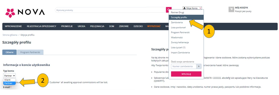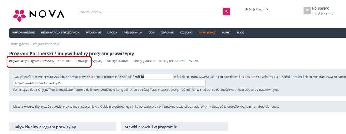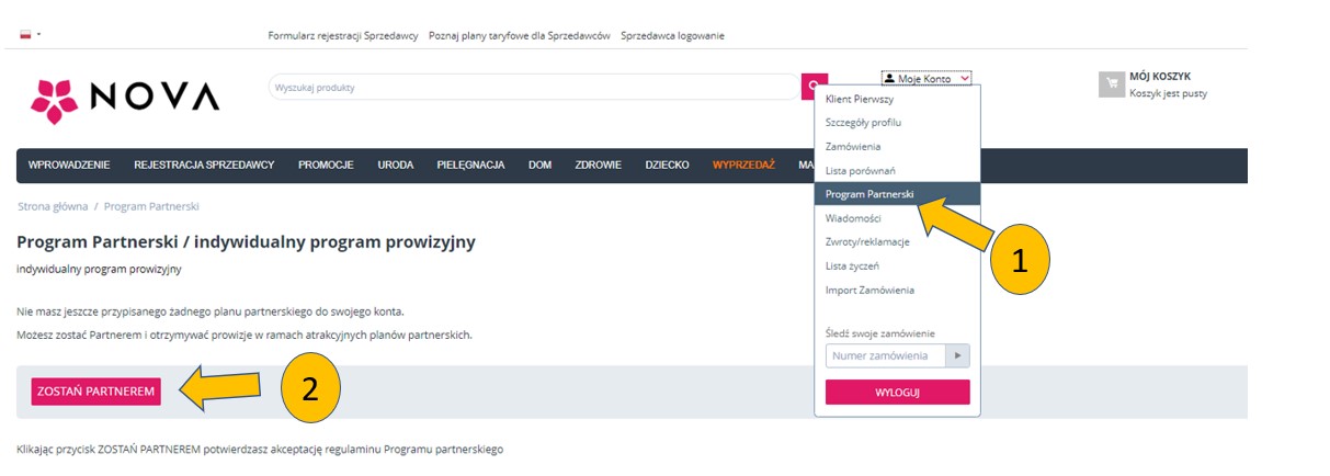 1. W celu przystąpienia do Programu NOVA Użytkownik posiadający Konto na Platformie NOVA składa wniosek o przystąpienie do Programu NOVA poprzez kliknięcie „ZOSTAŃ PARTNEREM” dostępne w „Moje Konto” – „Program Partnerski”. Kliknięcie przycisku „ZOSTAŃ PARTNEREM” jest równoznaczne z zapoznaniem się i akceptacją Regulaminu Programu NOVA.