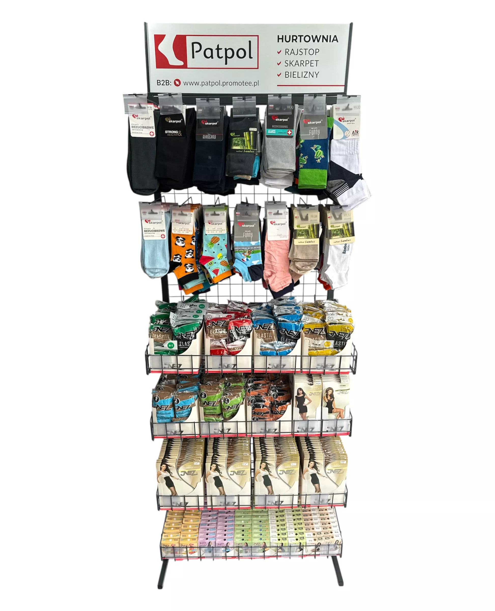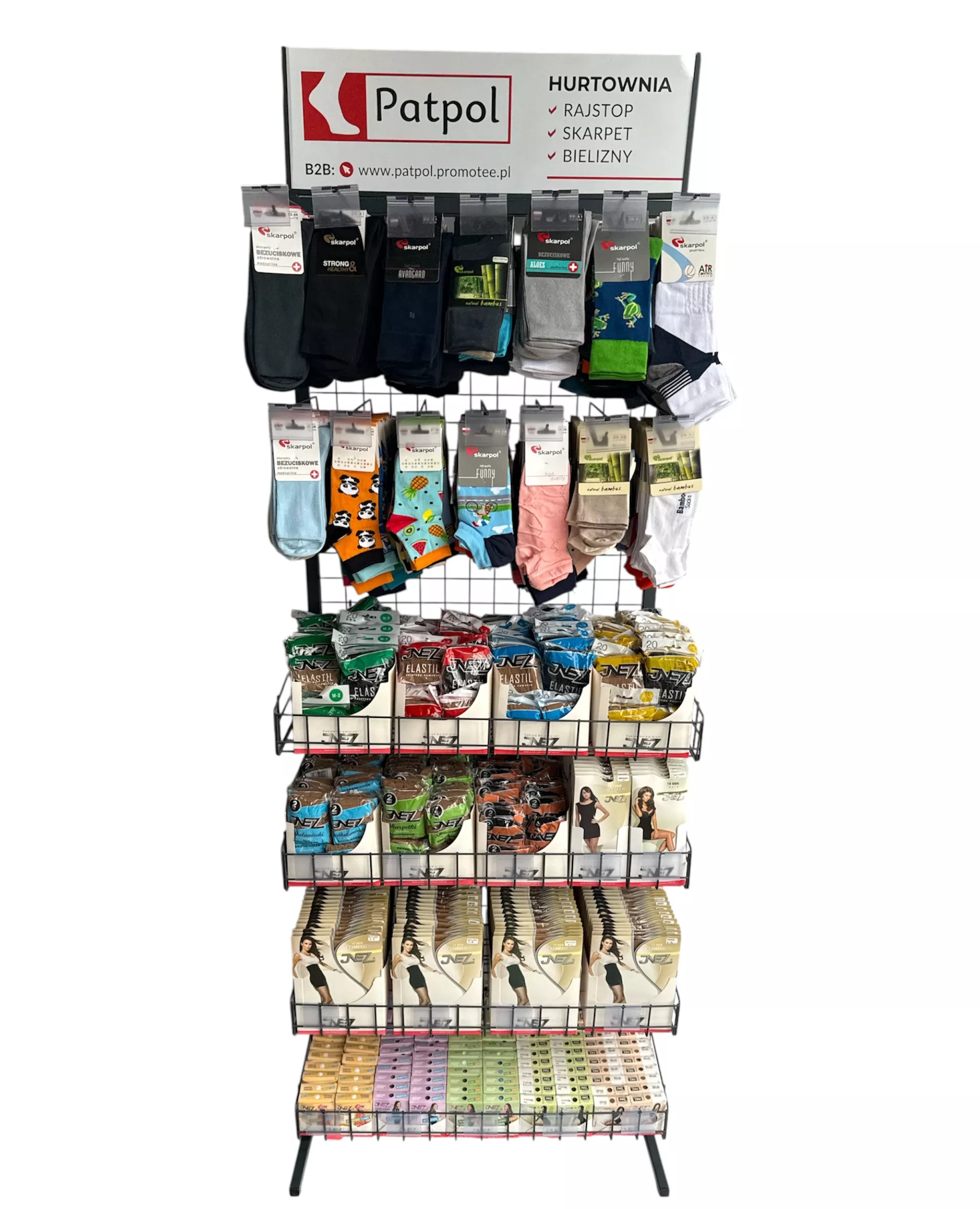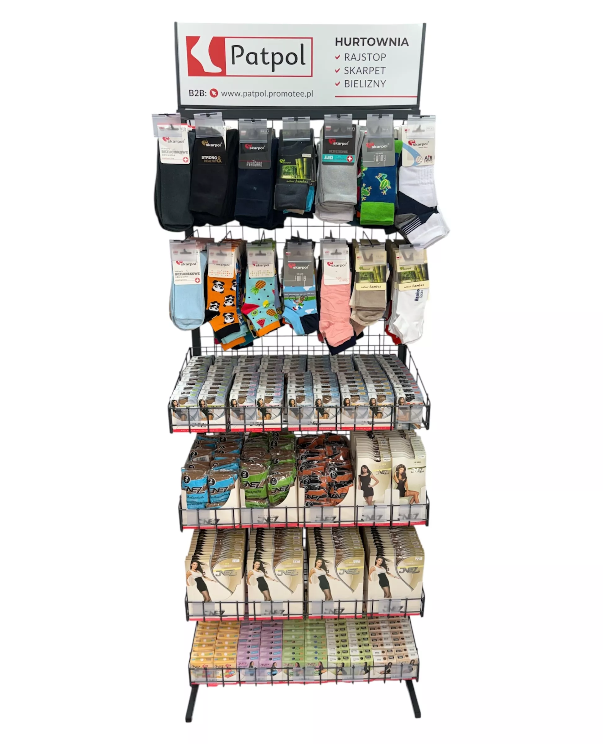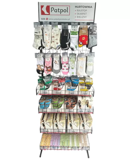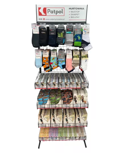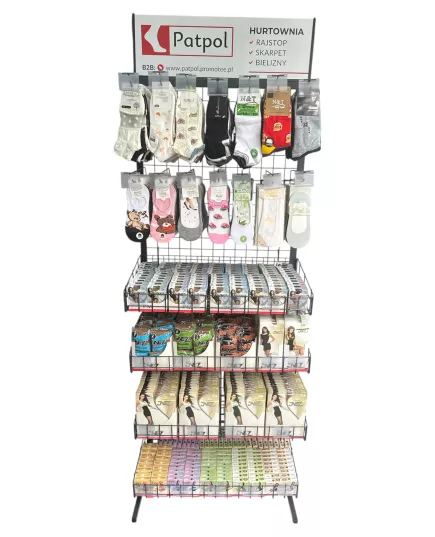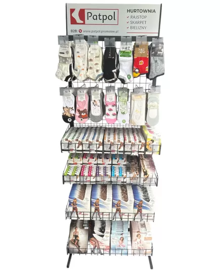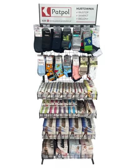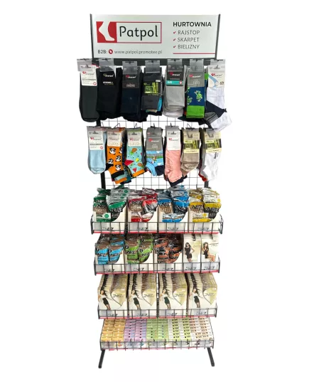Możliwość dowolnej konfiguracji ekspozytora: zamiana na same haki na skarpety lub kosze. Asortyment ustalamy indywidualnie. Przy stałej współpracy zapewniamy regularną opiekę przedstawiciela handlowego, który zadba o ułożenie towaru, wymiany produktów nierotujących i uszkodzonych oraz dobór asortymentu.