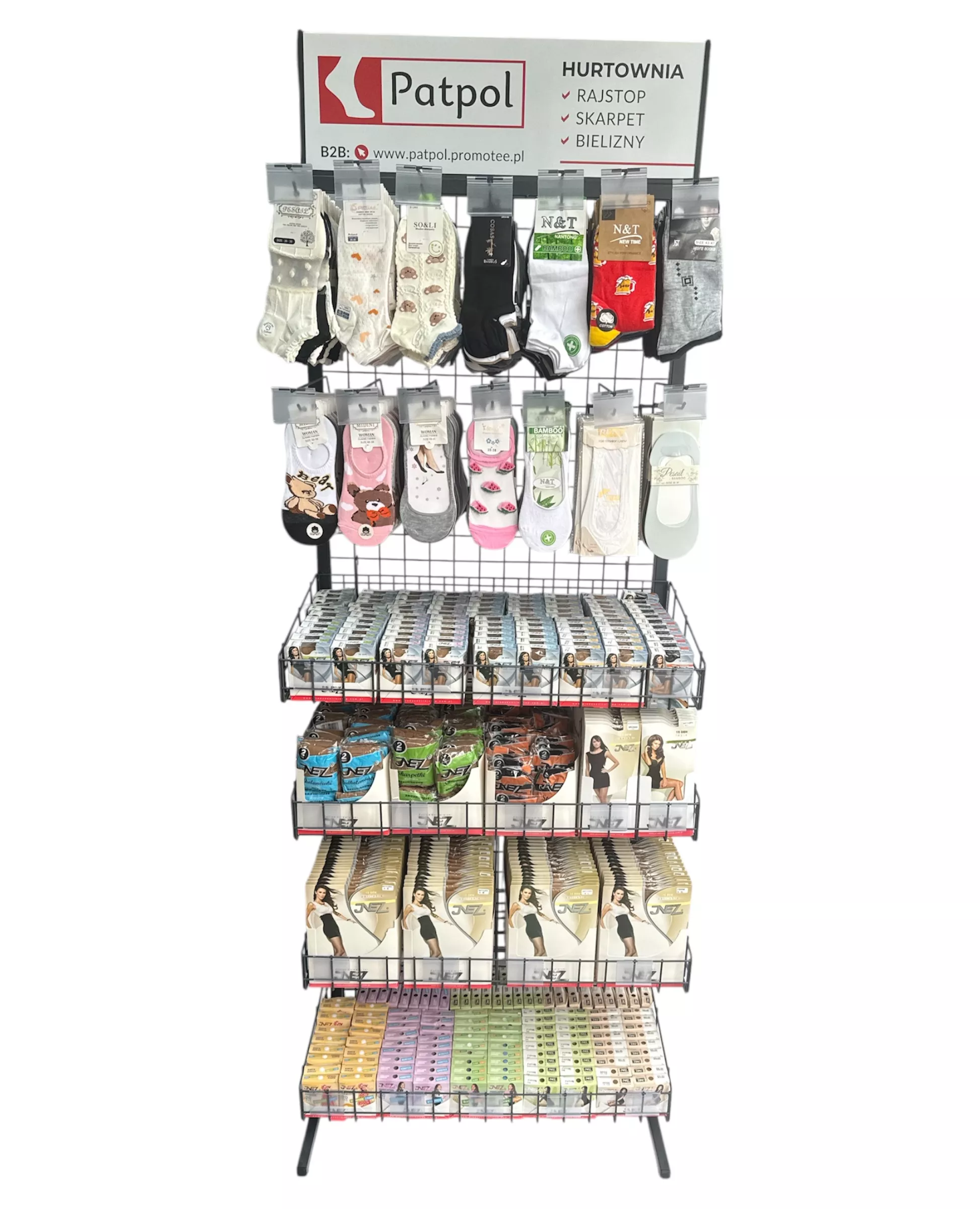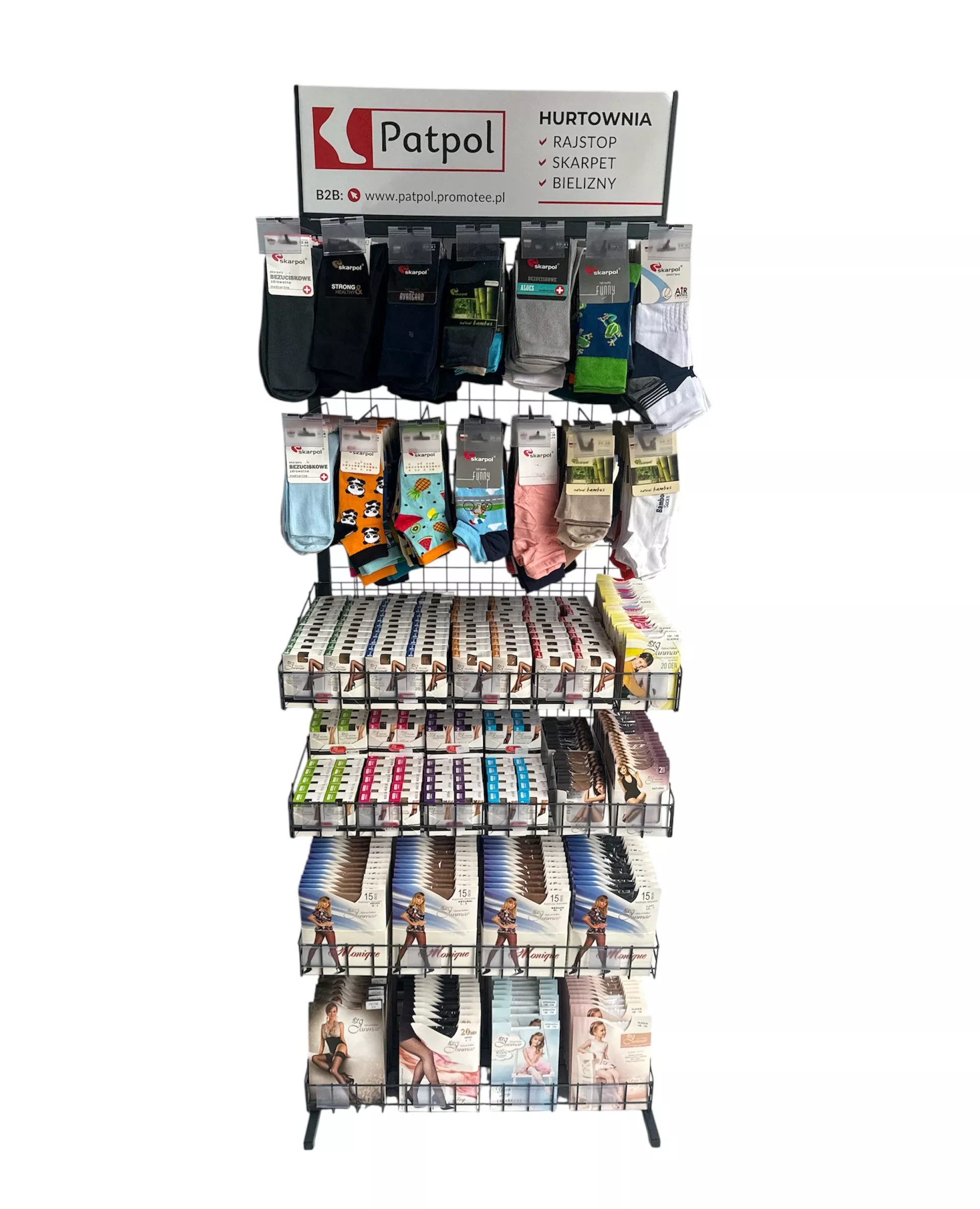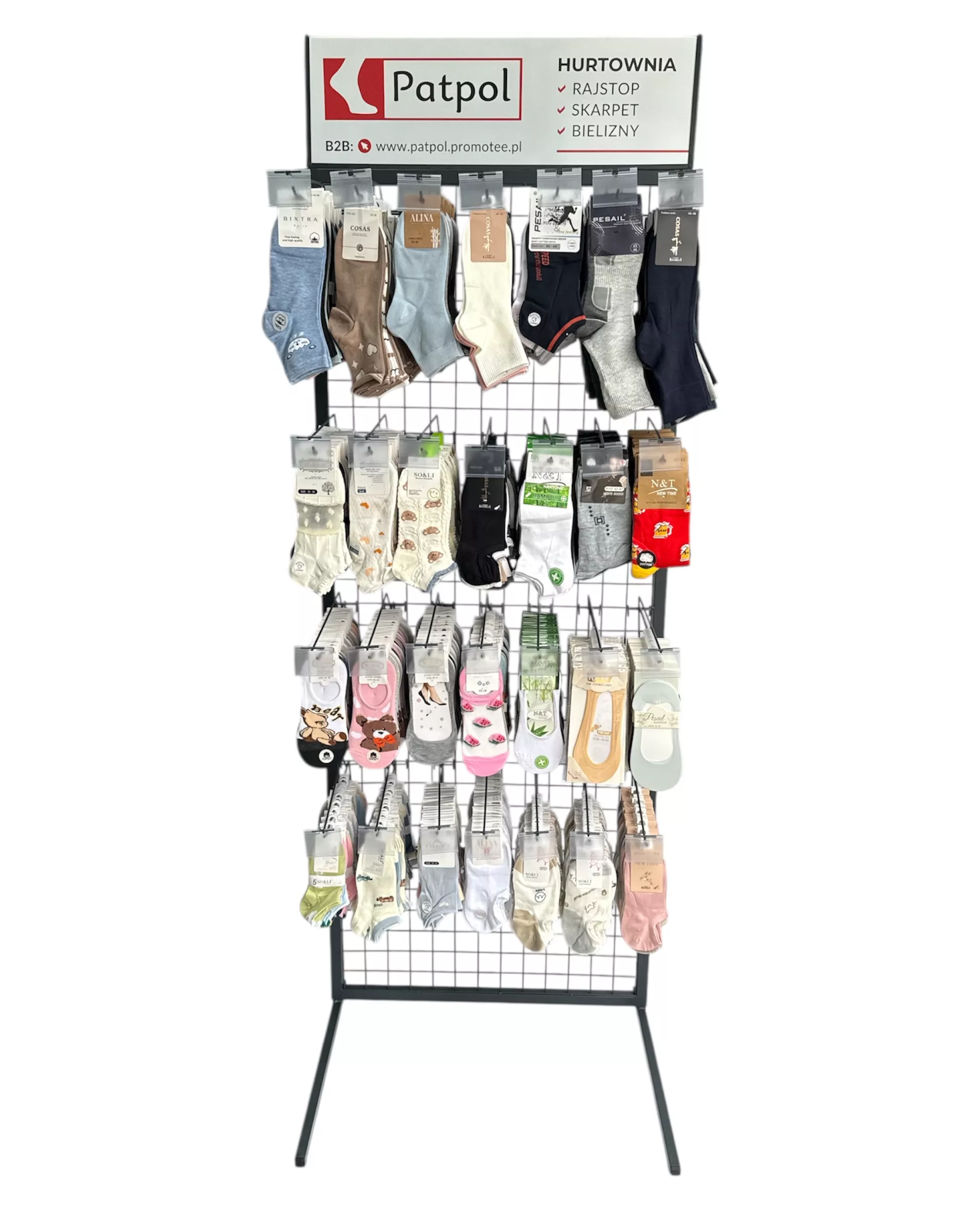 Możliwość dowolnej konfiguracji ekspozytora: zamiana na same haki na skarpety lub kosze. Asortyment ustalamy indywidualnie. Przy stałej współpracy zapewniamy regularną opiekę przedstawiciela handlowego, który zadba o ułożenie towaru, wymiany produktów nierotujących i uszkodzonych oraz dobór asortymentu.