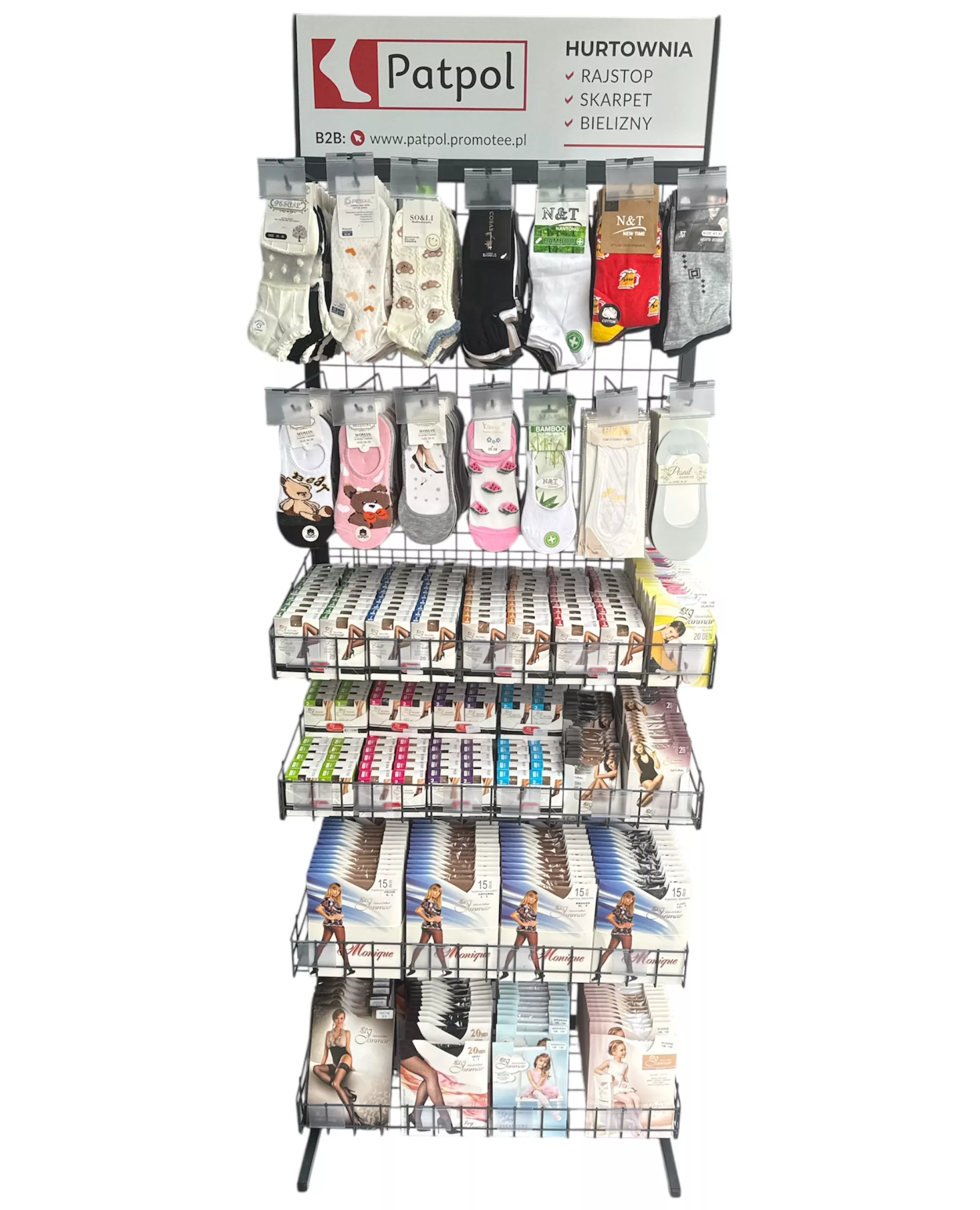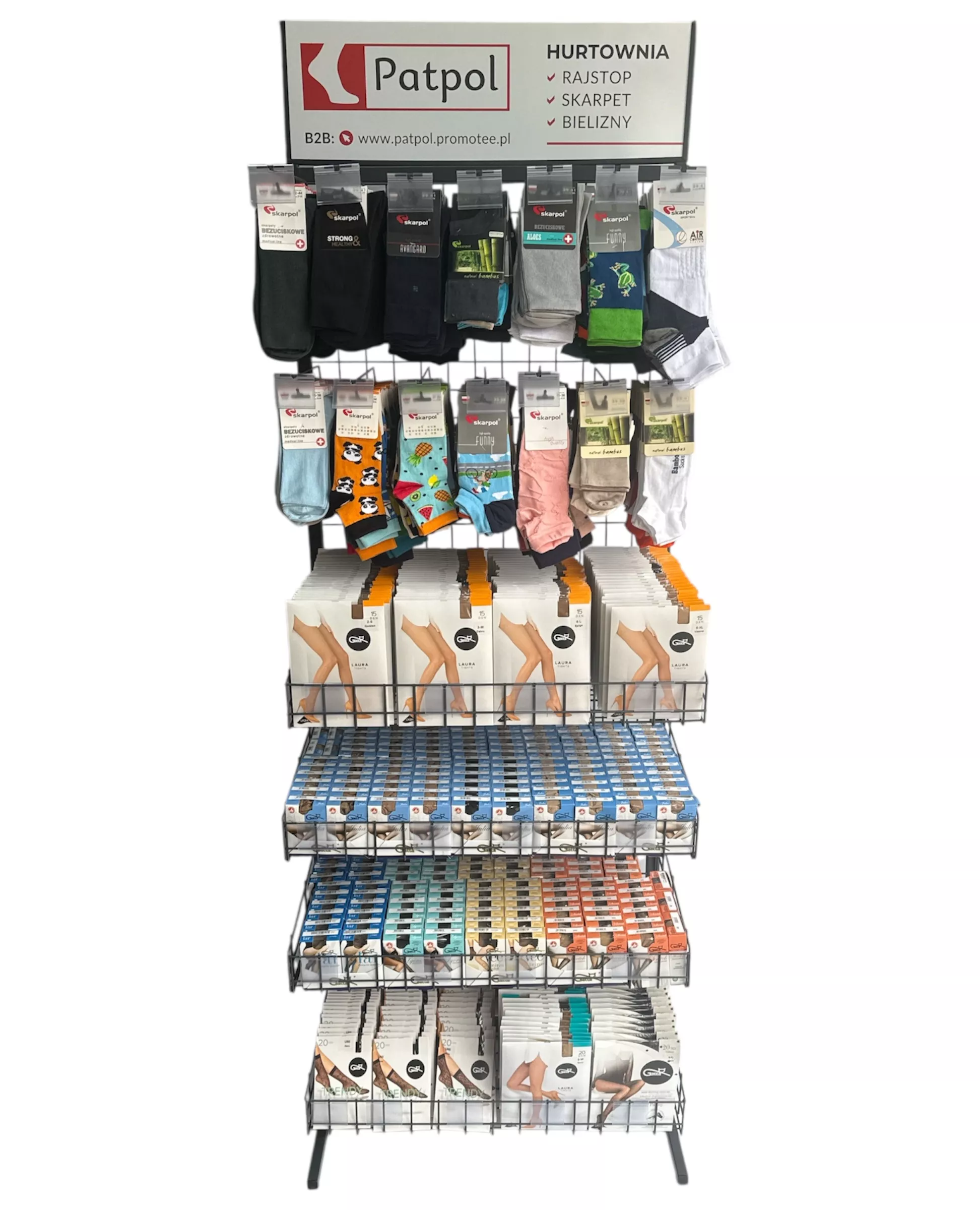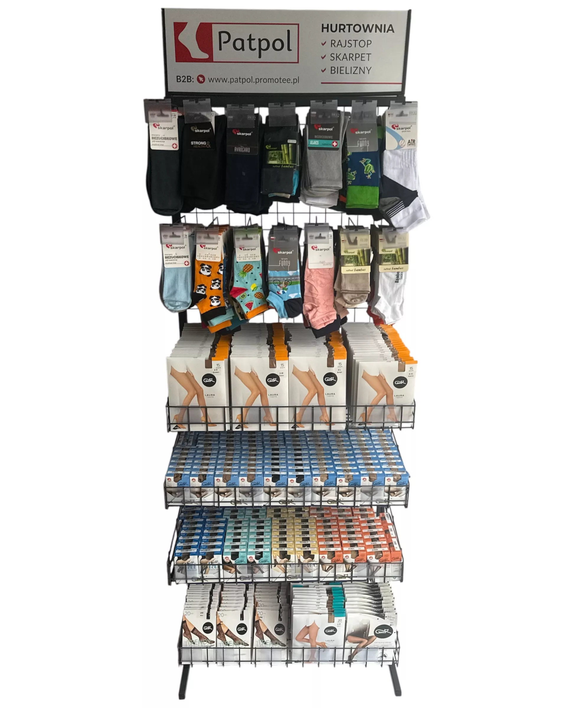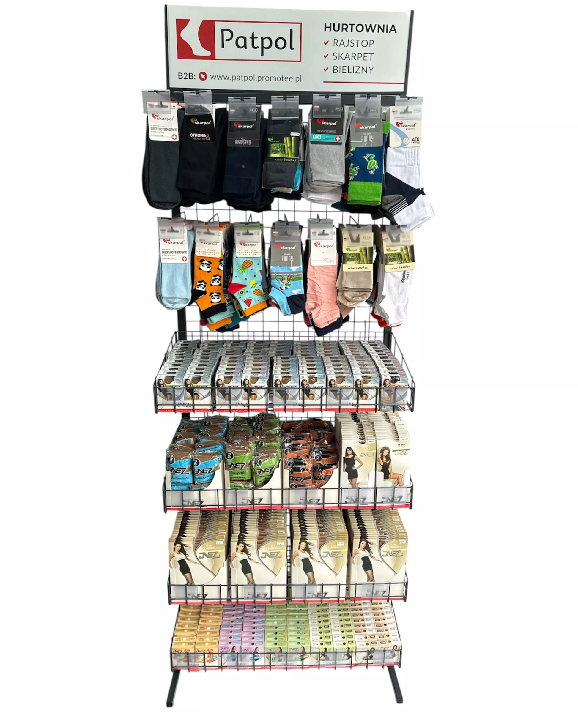 Możliwość dowolnej konfiguracji ekspozytora: zamiana na same haki na skarpety lub kosze. Asortyment ustalamy indywidualnie. Przy stałej współpracy zapewniamy regularną opiekę przedstawiciela handlowego, który zadba o ułożenie towaru, wymiany produktów nierotujących i uszkodzonych oraz dobór asortymentu.